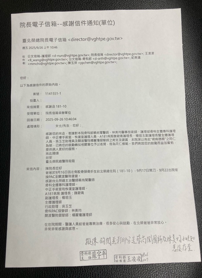 我是一位來自花蓮的患者叫曾OO女士,在榮總醫院因髖關節磨損要進行開刀手術。你是我的主治醫師,在治療期間你給我巨大幫助和支援,我在其中深受感恩。